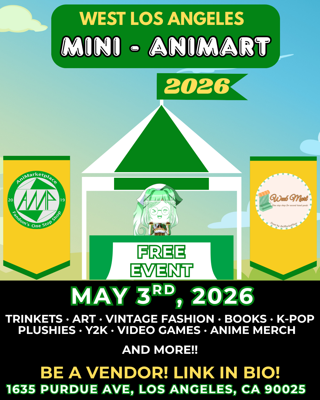 It's time for WEST LOS ANGELES MINI-ANIMART! We are once again partnering up with @westlafarmersmarket and @weebmart.moe to bring you our outdoor event for anything and everything anime related! Could it be collectables, figures, art, merch...? Only one way to find out, and to top it off, it's a FREE EVENT! We look forward to seeing you there!